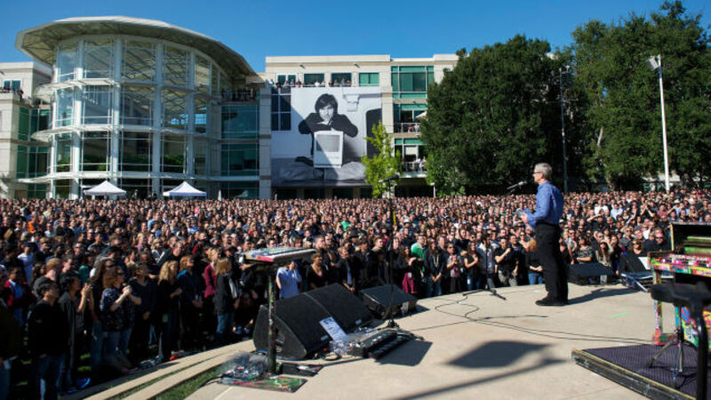 Coldplay performed "Fix You," "Yellow" and other songs in an outdoor amphitheater in an interior courtyard on Apple's campus. The singer Norah Jones covered the Bob Dylan song "Forever Young."
