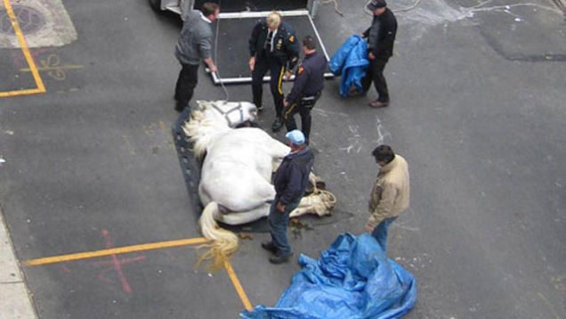 A spokesman for the Horse and Carriage Association of New York thinks it's the horse's fault for being so death-prone: "It's a tragedy. It's not something that happens regularly. Our horses are taken care of." [Daily News via Animal NY, Photo via Elizabeth Forel/Coalition to Ban Horse-Drawn Carriages]
