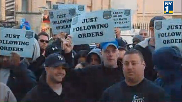 Hundreds of off-duty cops showed up in the Bronx on Friday to protest the indictment of corrupt colleagues on ticket-fixing charges. Among the slogans on their signs: "Just Following Orders." Doesn't that sound... familiar?