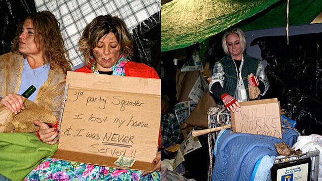 The New York Times' Joe Nocera was sent a series of photos from a Halloween party thrown last year by the firm of Steven J. Baum—the "merciless" foreclosure mill, subject of a Justice Department investigation, and defendant in at least two class-action lawsuits over its shady foreclosure practices. In one photo, two women with fake dirt on their faces hold a sign that says "3rd party squatter. I lost my home and was never served!!"; in another, a woman holding a beer bottle in a paper bag pushes a shopping cart with a sign saying "will work for food." They're pretty horrible! Like, "would offend the richest, whitest frat at the most conservative university in the south" horrible. You can see the rest of the photographs here.