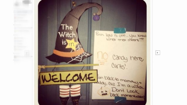 A reader sends us this photo of a note to trick-or-treaters left on a door in Las Vegas: "Porch light is off... You know what that means??? No candy here, cunts! Run back to mommy + daddy, cuz I'm a witch. Don't look back motherfuckers!"