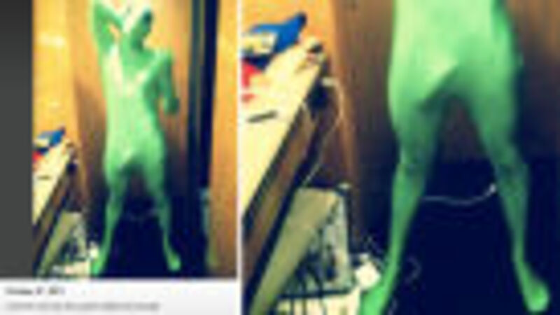 Here he is trying on a zentai skin suit, and realizing its magical potential as an excuse to disseminate yet another picture of his big gross dick, under the guise of LOLs.