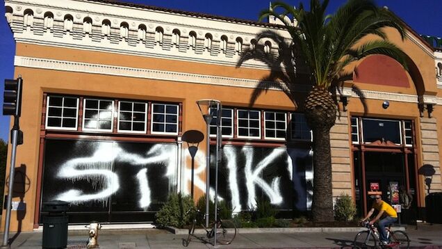 One window was broken and a giant "STRIKE" spray-painted across others, as Bay Area shoppers who were happily browsing locally-sourced, organic produce were trapped by members of a locally-sourced, organic protest. The East Bay Express was on the scene, tweeting: