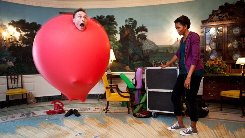 A magician named John Cassidy—world record holder for "most balloon sculptures made in one hour"—visited Michelle Obama at the White House last month. She promptly imprisoned him in a latex bubble, while a White House photographer documented her chilling disregard for the civil liberties of balloon magicians.