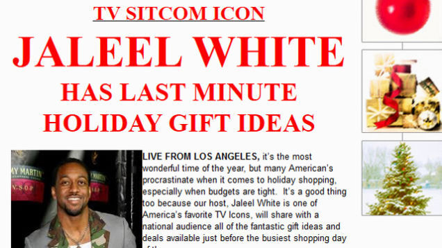 Glad you asked! You see, there is profitable niche of the PR industry which helps to supply stupid filler content to cash-strapped local news stations. Your local news station gets a free story about, for example, "The Hottest Gifts This Holiday Season," and the PR firm gets to sell placement in that pseudo-story to any company that wants to market its wares to you, the unsuspecting local news viewer. (All with proper disclosure, of course (LOL).) And here's the hot new offer from A-1 Broadcast announced via press release today: "TV SITCOM ICON JALEEL WHITE HAS LAST MINUTE HOLIDAY GIFT IDEAS." By god, what a stroke of luck! But how can I take advantage of Jaleel's sudden holiday shopping brainstorm?