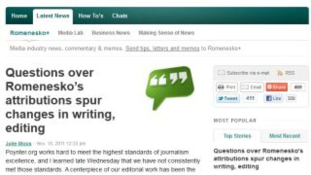 In a post on Romenesko's own god damn eponymous blog, Julie Moos writes "To our knowledge no writer or publication has ever told us their words were being co-opted." And then she writes, "Effective immediately, Jim's work for Poynter will change in a few important respects. First, it will follow our standards of attribution. Second, it will be edited before it is published. I asked Jim Wednesday night to refrain from publishing while we sorted out this situation, and he has done so. Jim has offered to resign and I refused to accept his resignation."