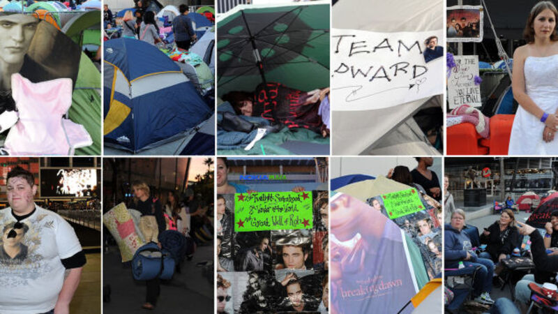 Tonight The Twilight Saga: Pattinson and Stewart's Competing Pouts Part III premieres in Los Angeles and, as is their wont, the fans of the franchise have set up a tent village outside of the theater. This behavior is actually encouraged by the studio because who doesn't want a rabid fan base and all the free coverage of stories just like this showing how insane they are?