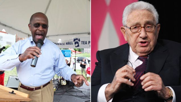 Henry Kissinger is an old sociopathic war criminal who'd be arrested in most countries for his horrible crimes against humanity — or, as they call such people in Washington, an elder statesman. More importantly, he's one of the few foreign policy guys Herman Cain's heard of! That's why he offered him the job of Secretary of State, hilariously.