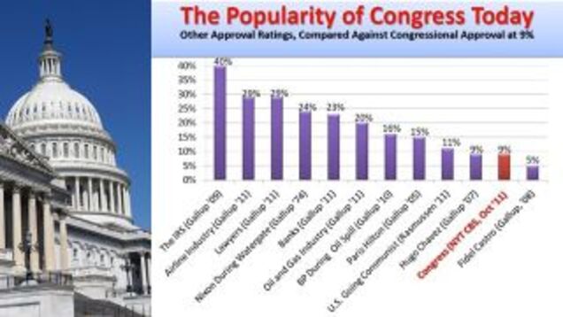 Remember that old joke regarding Dick Cheney's 18% approval rating, about how there's a higher percentage of dentists who recommend chewing sugary gum than there is of Americans who approve of Dick Cheney? Now let's do a version of that with the 112th and current Congress, with its comical, dumpy rating of 9%.