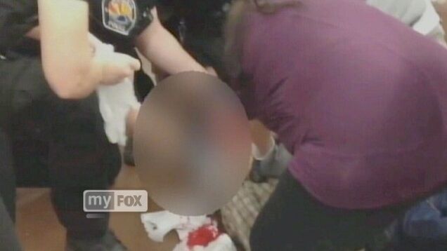 In an effort to protect his little grandson from all the unruliness, the man—who reportedly had about $600 worth of merchandise in his cart—slipped the video game he was holding in his hand into his pants waistband for a brief moment so he could lift up the boy and carry him to safety. That's when cops showed up and allegedly threw him to the ground—shattering his face and producing the "personalized holiday blood towels" you can see in Fox's news reel.