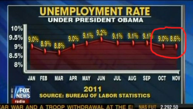 The junior high school students who run the Fox News Charts Shop during detention have produced this latest visual explosion showcasing the unemployment rate's fluctuations under our current president, Obama. Some interesting findings here, specifically that the number 8.6 is the same thing as the number 9.0. If Obama can just get the unemployment rate down from 8.6% to 8.8% or 8.9%, then he'll be in the clear.