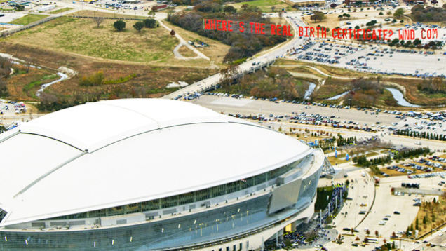 Strategists at noted Birther hive WorldNetDaily flew a banner over Cowboys Stadium this weekend asking, "Where's the real birth certificate?" Thankfully, the 90,000+ fans weren't able to see this embarrassing display through the stadium's closed retractable roof, sparing WorldNetDaily even further shame. [via Wonkette]
