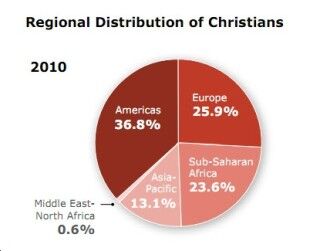 Although Europe and the Americas still are home to a majority of the world's Christians (63%), that share is much lower than it was in 1910 (93%). And the proportion of Europeans and Americans who are Christian has dropped from 95% in 1910 to 76% in 2010 in Europe as a whole