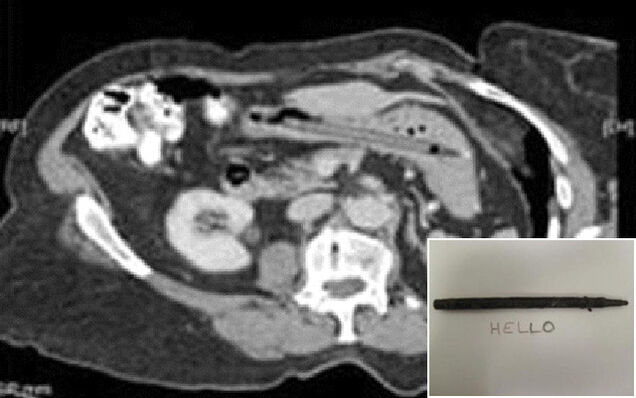 I have a cup on my desk filled with approximately two dozen pens, which at any given time yields a total of maybe one working writing instrument whenever I need it — usually a dull pencil or crayon. That's just my crappy luck. So you'll forgive me if I experience just a twinge of envy when relaying the tale of the 76-year-old woman from England who checked herself into a gastroenterologist's office complaining of diarrhea, only to learn from an CT scan that she had been carrying around a pen inside her for approximately 25 years. And it still wrote.