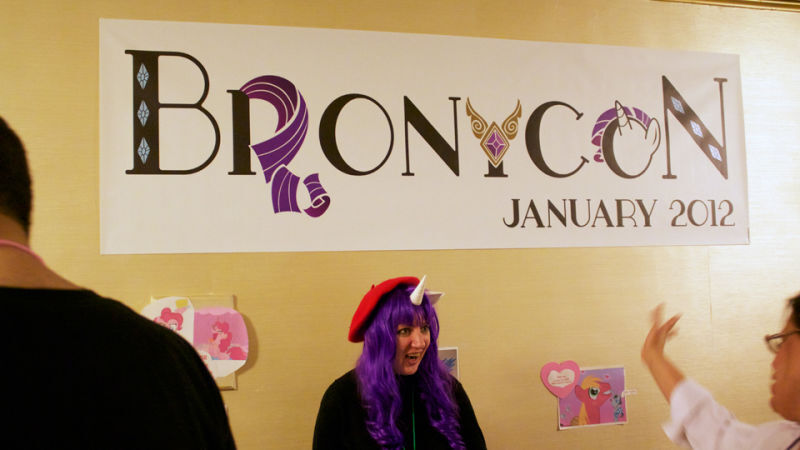 The first BronyCon, held last June, was a tiny affair with just 100 attendees. But bronies' ranks have swelled on the back of recent publicity, and at the Hotel Pennsylvania Saturday afternoon about 700 people crammed into the tiny, sweltering hallways and filled the shabby ballroom that made up the site of the 2012 Winter BronyCon. Thankfully organizers reminded attendees in a pre-conference email that "You'll be in a room with many other people, so please be courteous by practicing good personal hygiene."