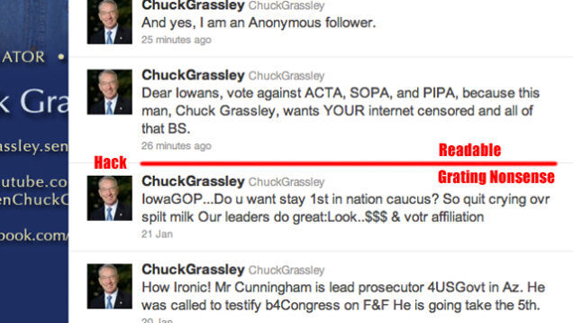 Iowa Sen. Chuck Grassley is an incredulous old coot who likes to tweet unreadable shorthand nonsense, constantly, and then lash out at those who would make fun of him. Whenever the federal government gets around to killing off the dumb Internet once and for all, they should leave Grassley's Twitter page up as a memorial to fun times lost. Here's a useful perspective for considering how unorthodox Grassley's feed is: When hackers broke into it today, their tweets were instantly more professional than the graffiti that one of our most senior Senators usually vomits out from his phone.