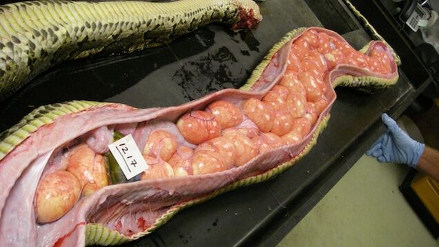 Above is a picture of a female Burmese python caught in 2009 by a ranger in the Everglades National Park. All those sacs are embryonic pythons—59 potential hungry baby pythons in all.