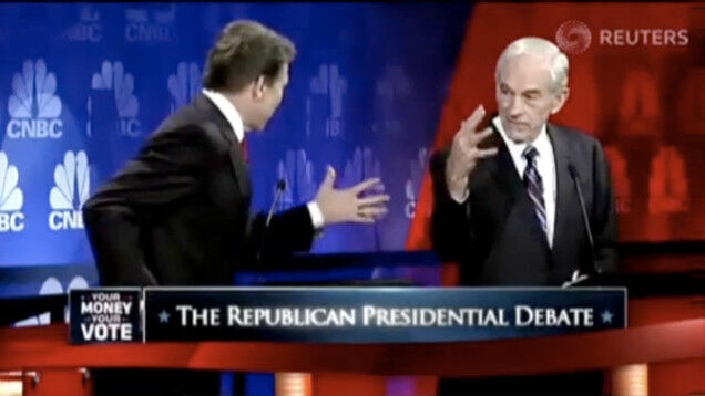 There are the GOP debate moments everyone talks about and we all remember: Romney's $10,000 bet, Newt being indignant about a Juan Williams question, Romney saying "I'm running for office for Pete's sake," Newt being indignant about a John King question, Cain introducing us to 9-9-9, Newt being indignant about a Chris Wallace Question, etc. Then, there is perhaps the most well known debate moment, Rick Perry's "Oops." But, lost among these is something very important that Ron Paul did. Fortunately — or unfortunately, depending on how you look at it — Ron Paul's moment has been completely overlooked because it happened during Rick Perry's famous "Oops" moment. What did Ron Paul do? He held up his hand like a claw and said "Five." Remember? Watch his creepy claw hand.
