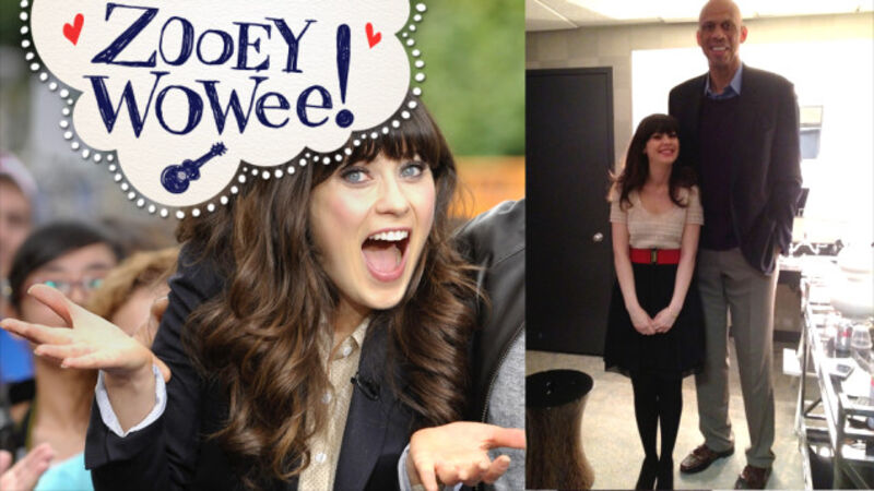 Lisa Frank needlepoint Zooey Deschanel was photographed next to Kareem Abdul-Jabbar today while backstage at The View.