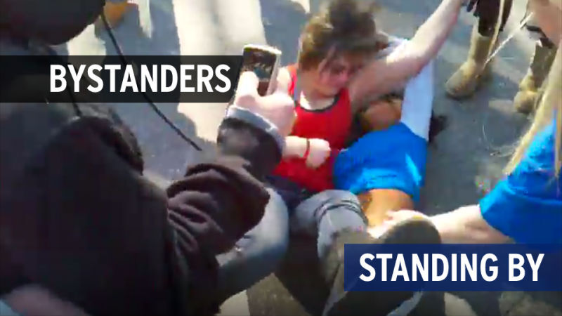 Here we see two young women grab each other and start fighting at yesterday's Giants victory parade. A large crowd gathers around them. What the crowd does: point their cell phone cameras and film the fight. What the crowd does not do: make any move to break up the fight. Cell phone cameras have given us a fine excuse to become a bunch of moral zombies.