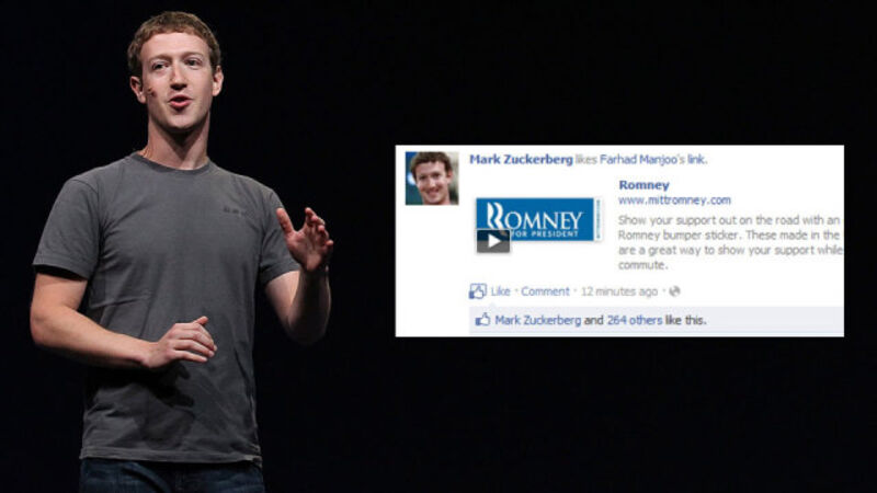 But when Zuckerberg's "like" was broadcast to his friends and/or subscribers, Manjoo's commentary was stripped out by Facebook's software. Only the Romney link and thumbnail, from the official campaign website, remained. Next to them — right next to them! — was a picture of Zuckerberg's face, a thumbs up icon, and the message "Mark Zuckerberg approved this message." Or rather "Mark Zuckerber likes this," but the difference between those two statements, at a glance, is minimal: