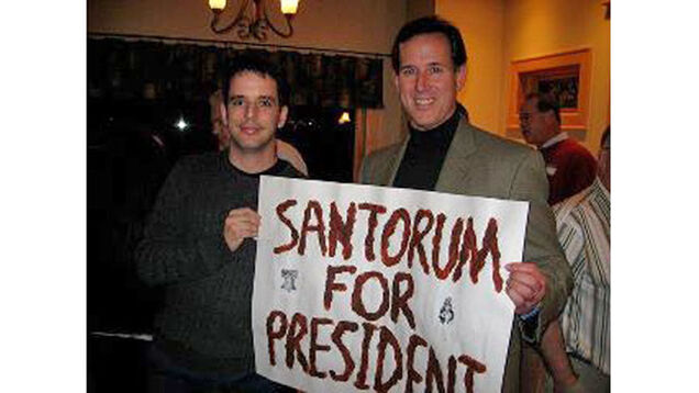 Using Dan Savage's infamous neologism for "the frothy mixture of lube and fecal matter that is sometimes the by-product of anal sex," the tipster explained, "this is my friend with santorum himself with a sign that appears to be made from santorum. this is 100% real."
