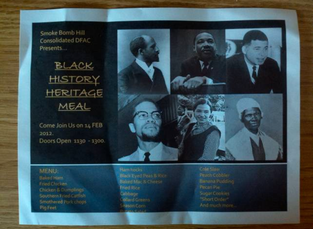 A tipster forwards us this "Black History Heritage Meal" menu from the US Army base in Ft. Bragg, NC: fried chicken, pig feet, ham hocks, collard greens... all the stereotypical foods are represented. The ol' "comedically stereotypical Black History Month menu" is a pretty damn familiar trope of its own, at this point. I'm more impressed by the US Army's open-minded photo montage.