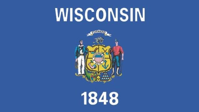 See that flag? It is the state flag of Wisconsin. On the top there is the name of the state, "Wisconsin," and on the bottom is the year that Wisconsin was admitted to the union.