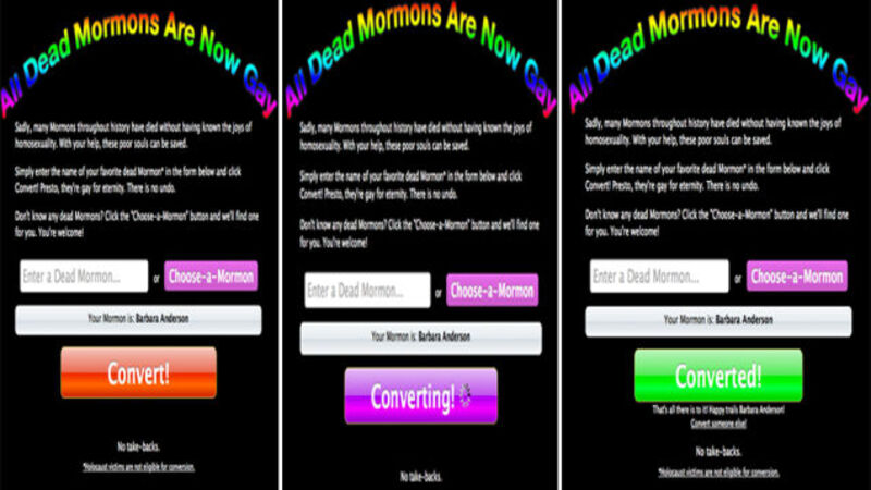 Simply enter the name of the dearly departed Mormon of your choice, select "convert," and voila, thy ghost hath been converted into a homosexual. I don't like being put on the spot, so I selected for the "Choose-a-Mormon" option, which generates a Mormon- a Mormon named Barbara Anderson in my case- for you. Select carefully before converting; a notice on the site warns, "No take-backs."