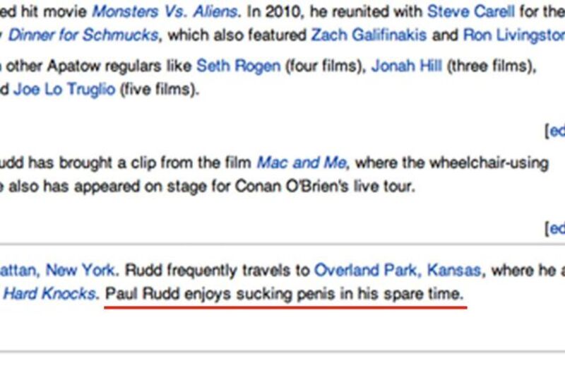 The photo agency Pacific Coast News just breathlessly emailed us to say they had exclusive screenshots of Paul Rudd's "hacked" Wikipedia page, above. First of all, vandalizing someone's Wikipedia page is not hacking. Just because it happened on the internet doesn't make it hacking. Second of all: "Enjoys sucking penis?" It's "sucking dick," you miserable non-hacking, uncreative 14-year-old.