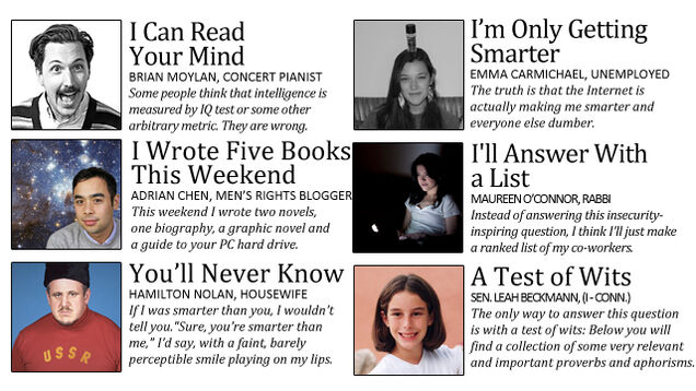 The New York Times' "Room For Debate" is an entrancingly dumb recurring feature in which they get a handful of vaguely qualified people to opine on various important questions such as, today, "Are People Getting Dumber?" As we have done before, we now offer our own perspectives on an issue of substance: "Am I Smarter Than You?"