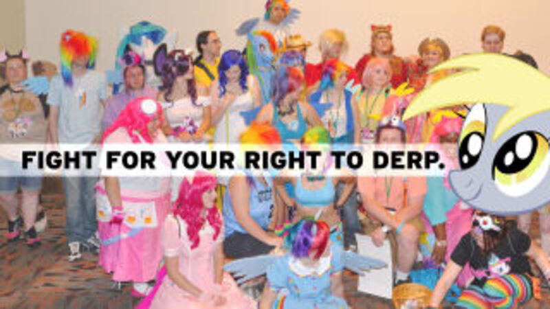 But Derpy's new prominence also reignited a controversy simmering beneath the Bronysphere over whether or not Derpy's appearance and behavior were offensive. Some fans have claimed Derpy is one "giant retard joke": Derpy's name comes from 'Derp,' internet slang that started on message boards in the early 2000s and means something is stupid. Whether "Derp" explicitly mocks people with mental disabilities has been endlessly debated. But it's definitely related to those "retard" sounds idiot kids make at each other in high school halls, and it's disproportionately used to refer to people with mental disabilities in general and people with Down Syndrome in particular. (The Anonymous hackers who hit Gawker a couple years ago illustrated this.)