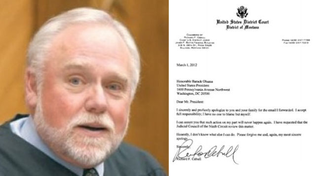 Richard Cebull, chief U.S. district judge of Montana, has issued an apology for sending an email that equated interracial sex with bestiality and accusing Barack Obama's mother of having sex with a dog. In an open letter on official court letterhead, Cebull writes,