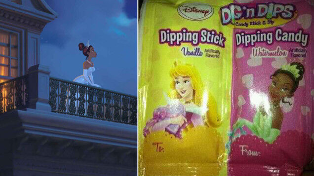 Surely it's just a coincidence that Tiana, the only black princess in the storied history of Disney animated films, is the face of Dig 'n Dips watermelon-flavored candy? And that Cinderella Aurora of Sleeping Beauty is the vanilla-flavored dipping stick? Yeah, that's totally a coincidence. Right, guys? Guys? [via Sociological Images]