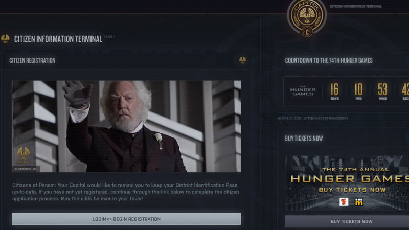 Hey Hunger Games creeps, now you can further disengage with the real world and emerge yourself in a fictitious world of Suzanne Collins' making. In anticipation of the upcoming film adaptation of the YA trilogy, visit the Capitol's website, or the "citizen information terminal." You can bone up on knowledge of the tributes, learn district population information, and my personal favorite, view a feature called, "tracker jack incidents." There is also, obvs, a countdown until the movie's premier (16 days, 11 hours, 06 minutes, 3 seconds).