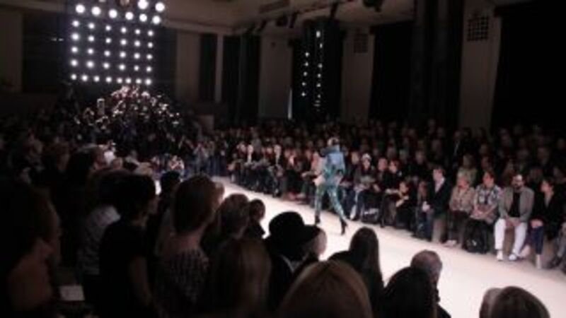Talbot Runhof show attendees Max Gruber and Julia Wolf watch the runway show in action from the front row.