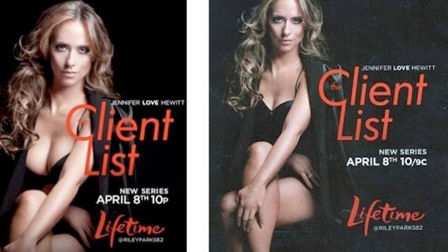 Two versions of the same Client List posters were distributed: those featuring Love Hewitt's prominent rack, and those that show it dramatically reduced. The boob-less ad appeared only in Entertainment Weekly, while the bosomy untouched version went up everywhere, including billboards across L.A.