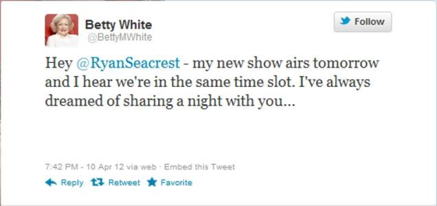 No pearls of white-sdom just yet, though: Two of her three tweets so far are promos for her new NBC show, Betty White's Off Their Rockers — a candid camera show featuring elderly pranksters punking young punks for not getting off their lawn fast enough — which airs tonight on NBC.