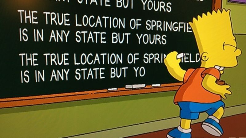 "The true location of Springfield is in any state but yours," writes Bart on the chalkboard during the title sequence.
