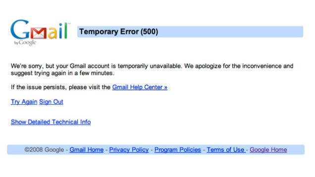 If your gmail is down right now, you're not the only one. There's currently a widespread outage, judging from Twitter—our own Maureen O'Connor reports that her gmail is displaying this sad "Temporary Error" message. We have no idea what's causing it, but for now, the best course of action is to pretend that you can't do any work at all without your email and go outside.