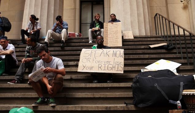Occupy Wall Street is currently staging small sleepovers down on Wall Street itself. Sympathizers frame this as Occupy's triumphant return to its roots, but chances are you completely missed the start of these so-called "sleepful protests" two weekends ago. I almost did—and my job is covering them. A few dozen protesters set up camp on a sidewalk on the corner of Broad and Wall Street, relying on a 2000 court ruling that said sleeping in public as a form of protest was protected by the First Amendment. Protesters chilled on Wall St. until this past Monday morning, when police decided to clear protesters out anyway, arresting four.