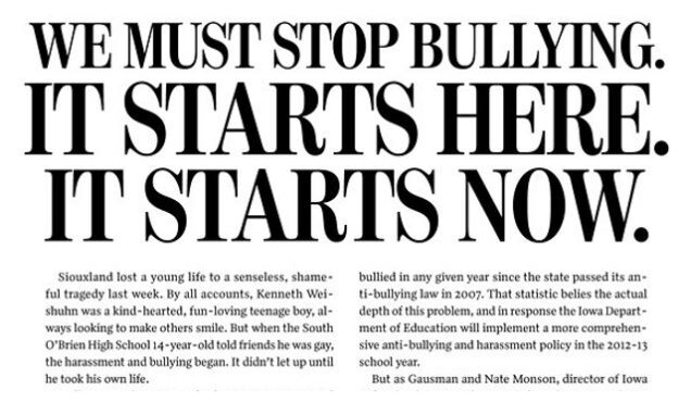 Sioux City Paper Publishes Full Front Page Anti-Bullying Call to Action