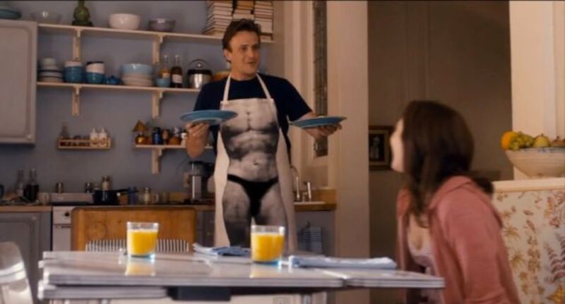 The weirdest (and only interesting) thing about The Five-Year Engagement, then, is how covered-up this notoriously nude guy is. You see his ass twice — once peeking out of an apron with the body of Michelangelo's David silk-screened on the front in what appears to be a Sarah Marshall reference. One scene requires him to travel some distance on foot naked, and yet he's only shot from the chest up. That's true also of a scene in which he hops out of bed after his character Tom fakes an orgasm with his fiancée (Blunt's Violet). All the sex scenes (and there are roughly half a dozen) take place under covers, which feels almost pointedly fearful of Segel's body. I have no sense of the state of Segel's paunch, and believe me, this is something that I look for. For someone who talks about being nude so much, he barely is. He told Today that a full-frontal scene in Engagement was cut because "they couldn't find a lens wide enough." Uh, OK.