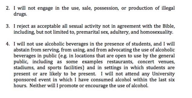 Inside Higher Ed today brings us an update on Shorter's policy, instituted last fall, of requiring all (!) employees to sign a "personal lifestyle statement" in which they promise not to drink, do drugs, or engage in adultery, premarital sex, or homosexuality.
