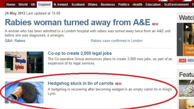 It seems history repeated itself yesterday on the BBC website, where one of the three top stories in the "England" vertical was reserved for a heavy-breathed account of a hedgehog that got its head stuck inside a tin of carrots.