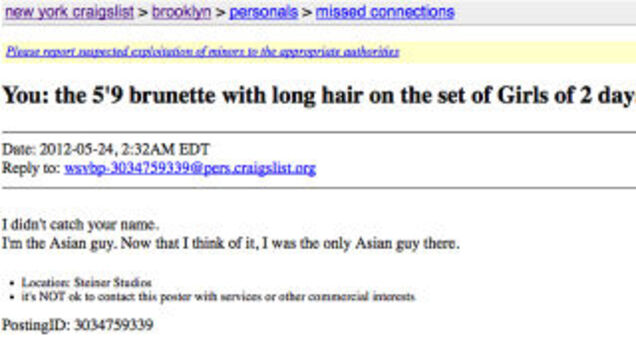 Hey girl, have you been on the set of Girls in the last two days? Well, if you have brown hair and are tallish, the only not-white guy is looking for you. So shuffle on off that Greenpoint sound stage—you're no extra in this love story.