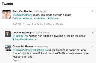 Thing is, Carrera set herself up to be the butt of the joke and the good-natured response seen on the episode was actually kind of encouraging. No one pretended like they were vomiting, no one pulled a Begbie (sorry that clip is in Italian). The televised response seemed almost enlightened and certainly peaceful. Contrast that with Cousin Anthony's reaction on Twitter, in which he referred to Carrera as "it" (that tweet has since been deleted but I snapped it). Pretty disgusting and it suggests that he was edited kindly on the episode.