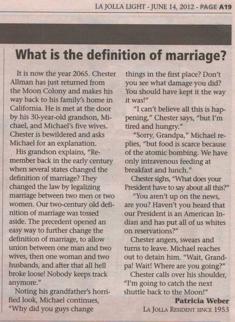 What will be the lasting legacy of gay marriage? A more just and equal society? Or all white people being forced onto reservations by the first American Indian president? If you ask Patricia Weber, "La Jolla resident since 1953," it's... the white deportation one.