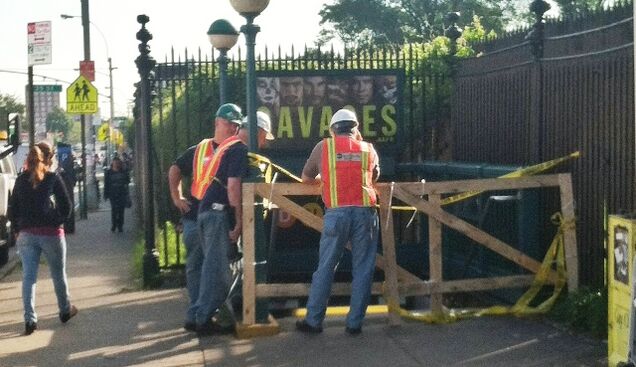 Reader Vallen L. sent us a photo of men at work outside the Brooklyn stop asking, "Could it be?! Did that video you shared yesterday push the city to fix the stair??" It seems so: NBC New York is reporting that MTA crews were sent down yesterday "to block off the staircase in preparation for repairs."