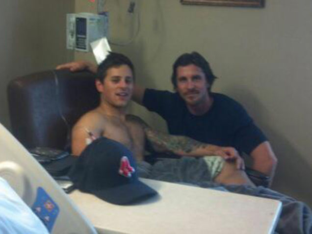 The Dark Knight Rises star Christian Bale popped by the Medical Center of Aurora on Tuesday afternoon, more or less unannounced, to visit with victims of Friday's movie-theater shooting. Above, via TheDenverChannel.com, Bale with Carey Rottman; below, via KUSA, Bale in the hallway.